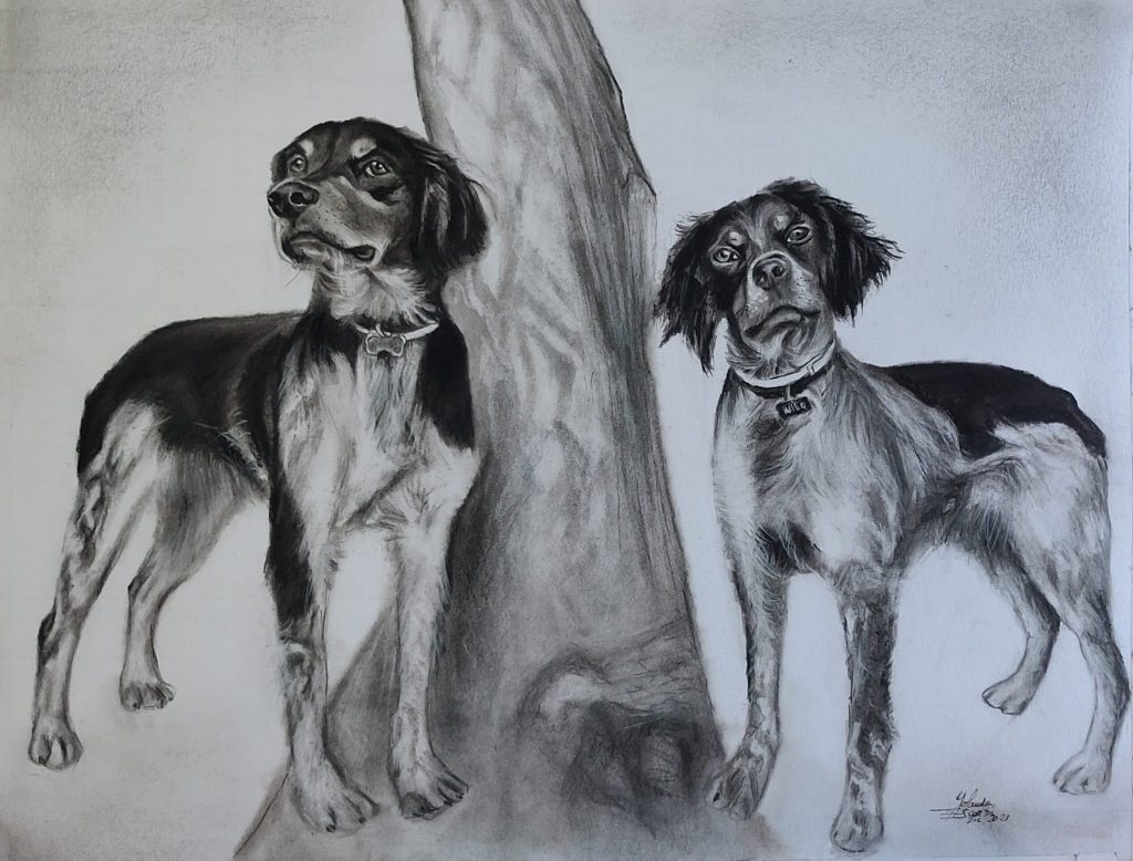 - Retrato de perrito pintado a mano en carboncillo y lápiz a partir de una fotografía